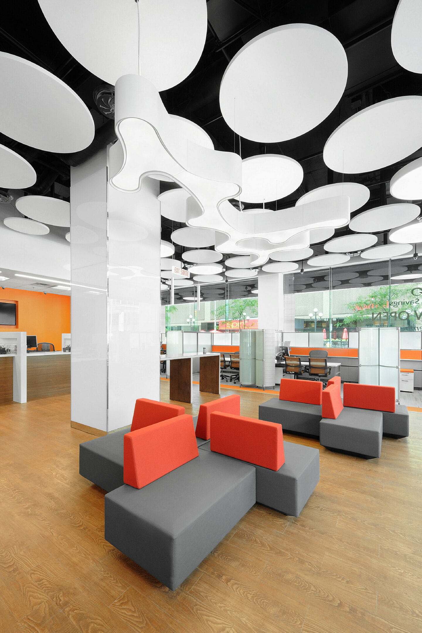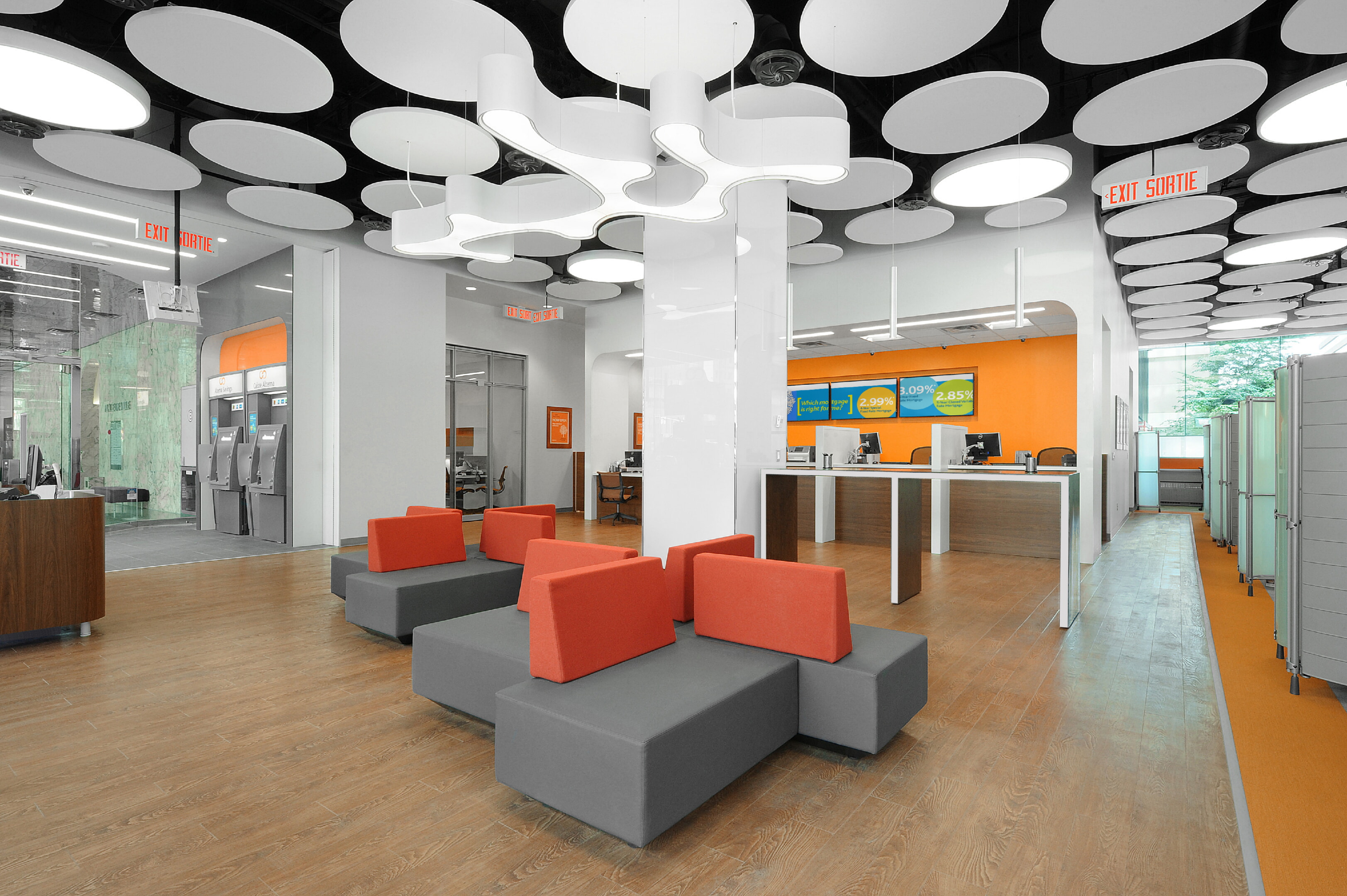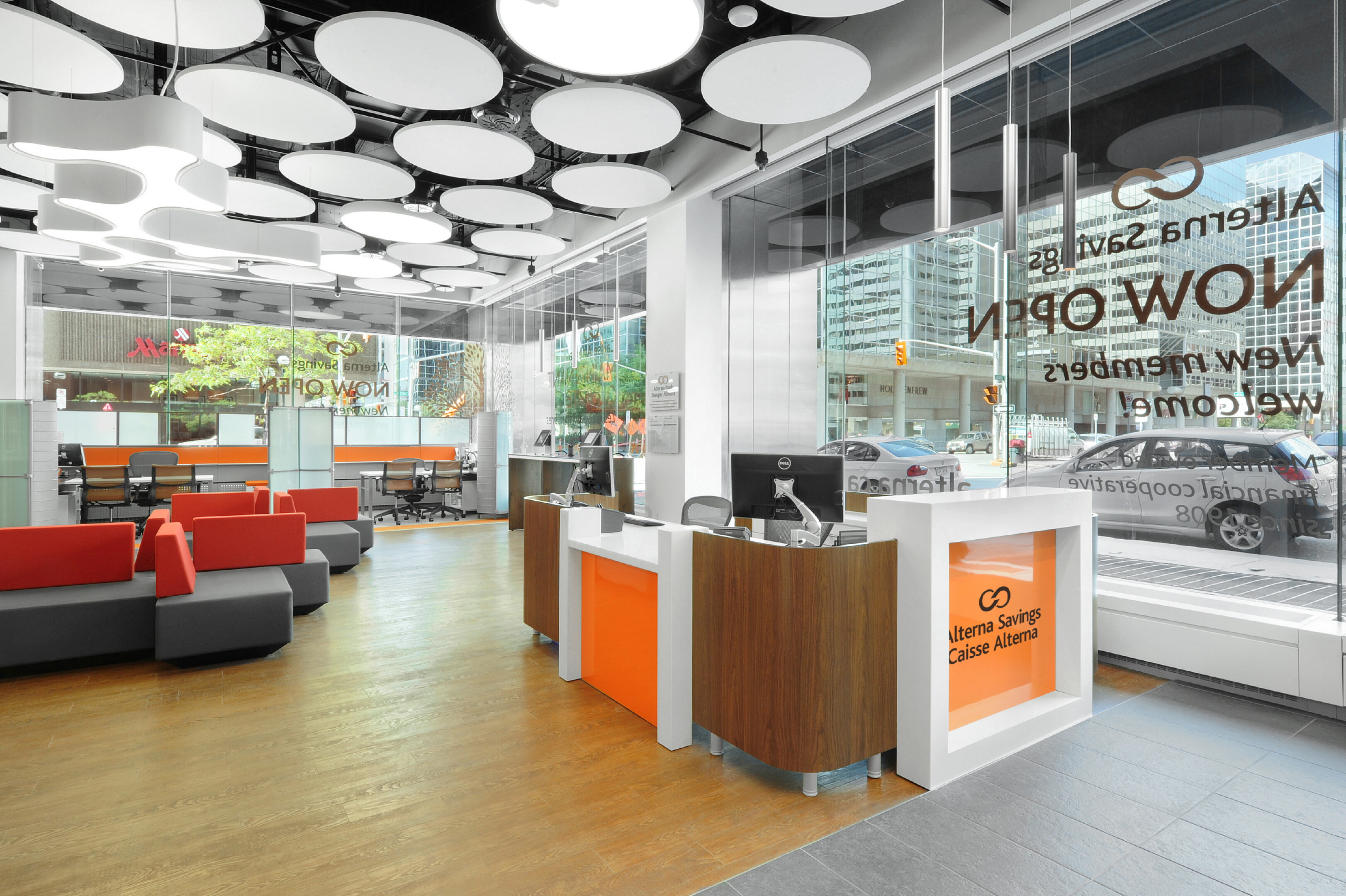 Flux Lighting worked with Chmiel Architects to develop the lighting design of Alterna Savings’ new flagship branch, located in downtown Ottawa. It was important that the new branch reflect the vision and values of Alterna, a credit union with longstanding roots in Ontario. Floor to ceiling glazing, the mixture of straight and curved geometries, as well as warm and crisp materials help to create an environment that is friendly, vibrant, and inviting.