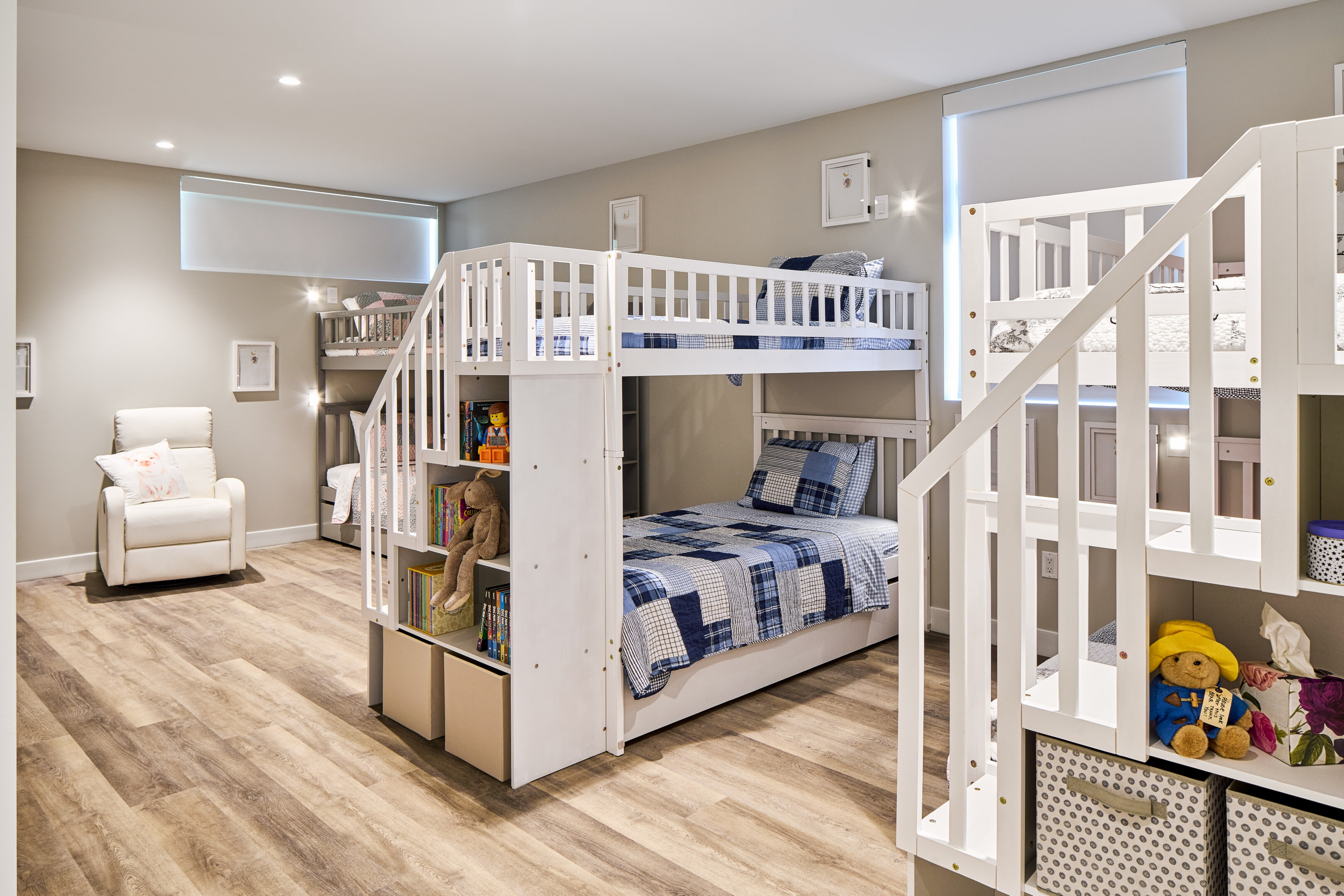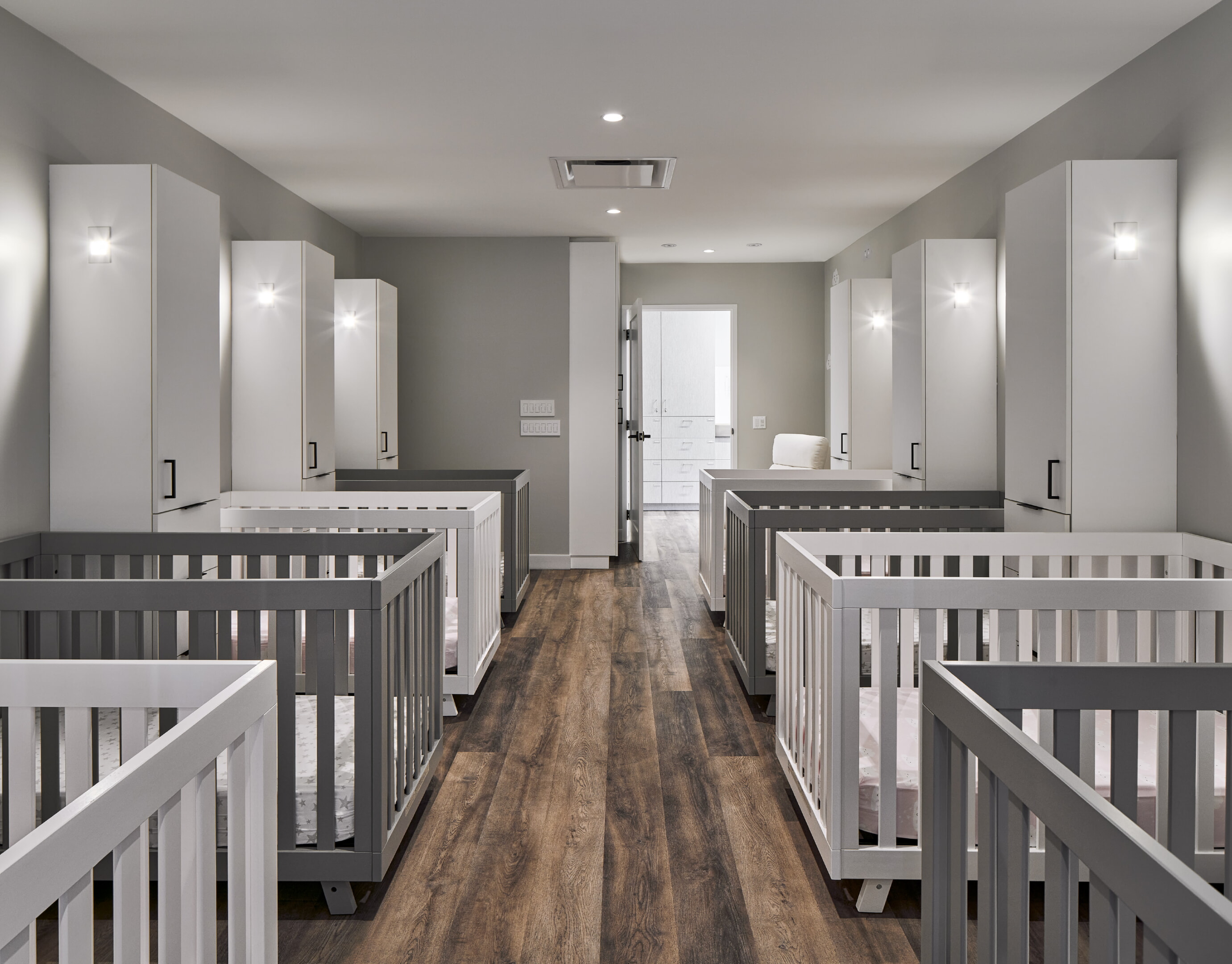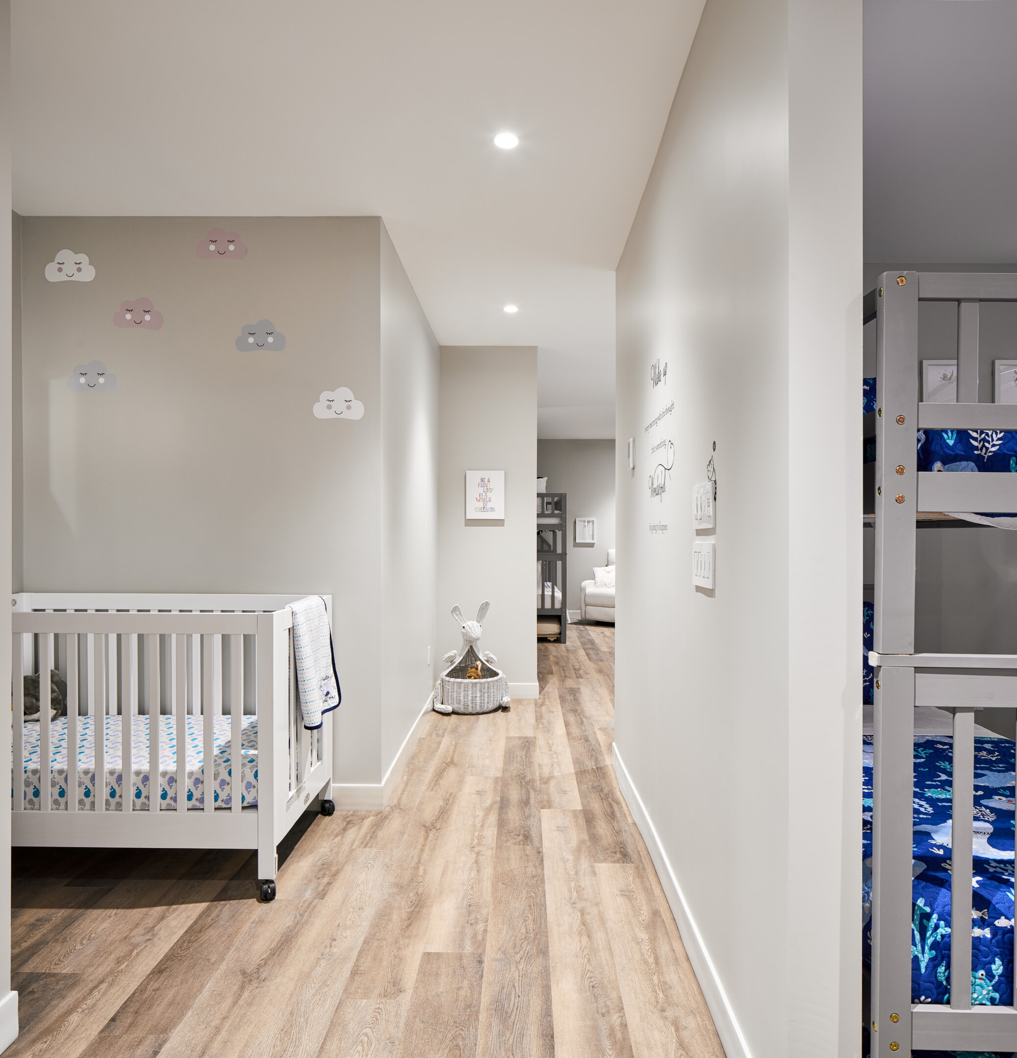 “They wanted the longevity and durability of a commercial interior but the comfort of home so children could feel it was their “home away from home”. – Parallel 45. Every aspect of the space is designed with it’s small occupants in mind, including the unique use of the Kuzco Sonic Step Lights as bedside nightlights that are safely flush to the wall!